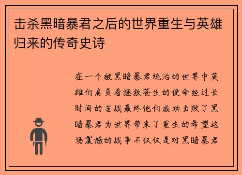 击杀黑暗暴君不仅仅是一次战斗的胜利,它代表着一段历史的终结与新纪元的开始。英雄们用自己的鲜血与生命,换来了世界的重生与希望。然而,重生并非易事,世界的恢复需要英雄们的持续努力与牺牲。在英雄们归来的荣耀之下,是一段充满挑战的重建之路。