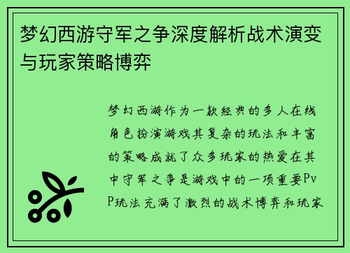 梦幻西游作为一款经典的多人在线角色扮演游戏,其复杂的玩法和丰富的策略成就了众多玩家的热爱。在其中,守军之争是游戏中的一项重要PvP玩法,充满了激烈的战术博弈和玩家之间的策略较量。本文将从多个角度深入解析梦幻西游守军之争的战术演变,并探讨玩家在其中的策略选择与博弈过程。首先,我们将回顾守军之争的起源和基本玩法,接着通过分析战术演变、玩家策略应对、协作与对抗、阵容搭配等四个方面,全面揭示这项玩法背后的深层次博弈。最后,我们将对全文进行总结,并探讨未来可能的游戏趋势。